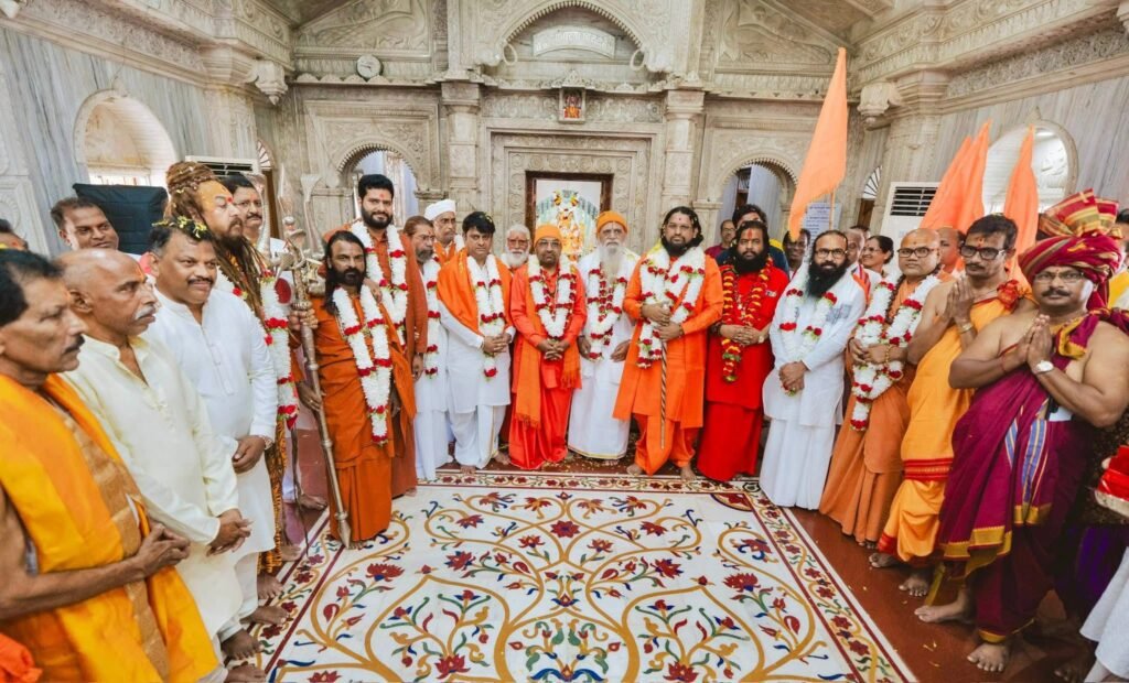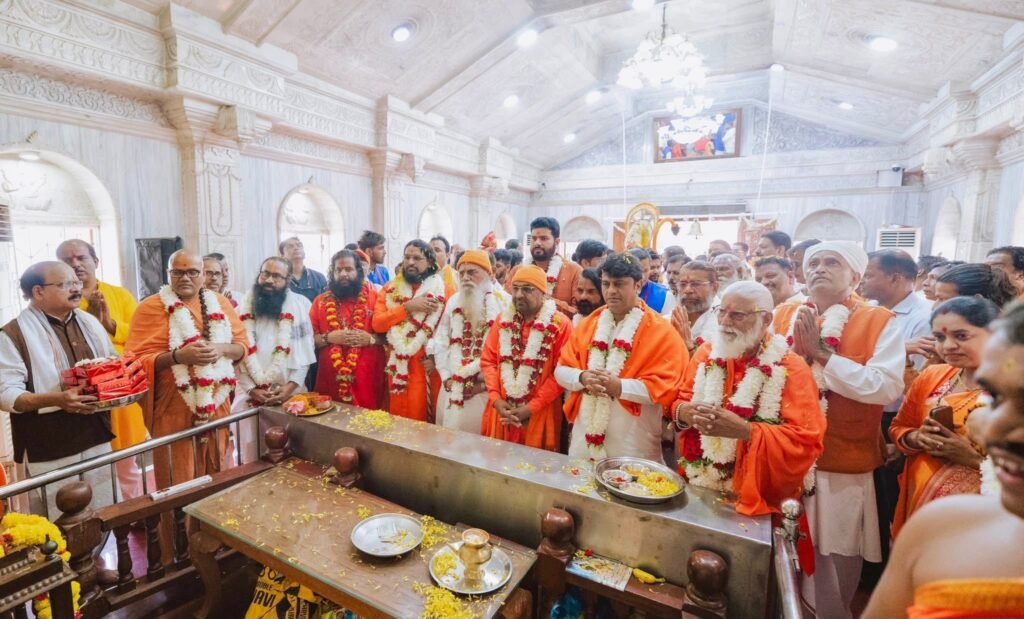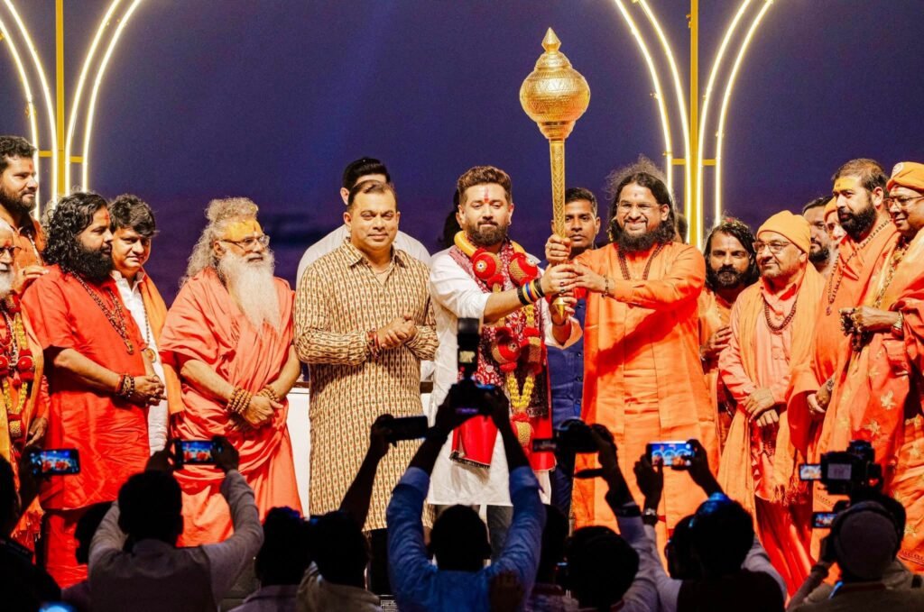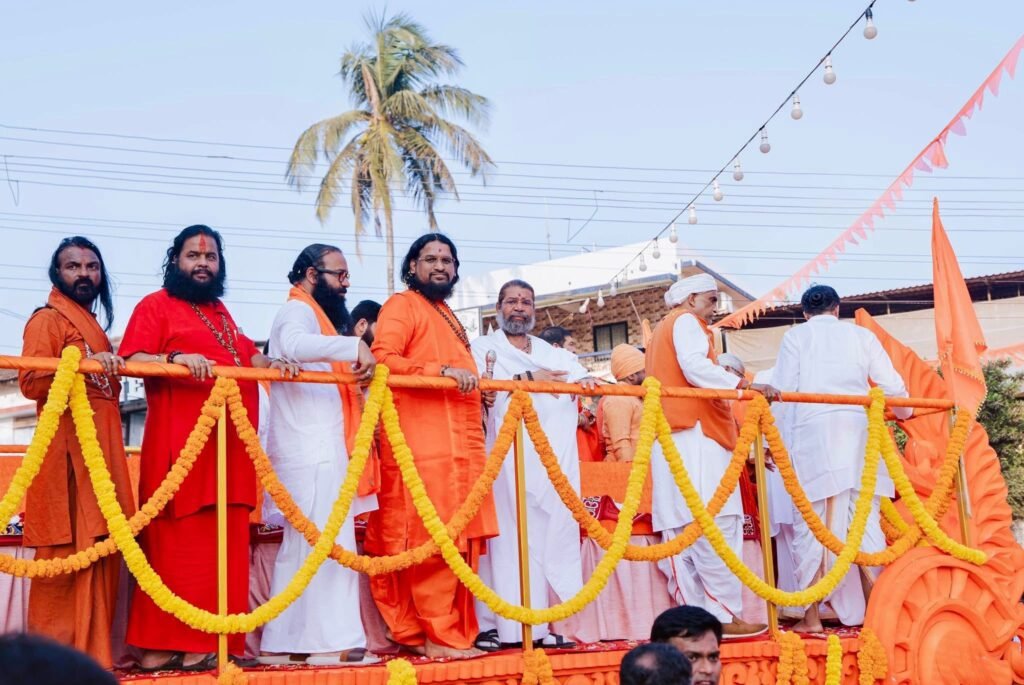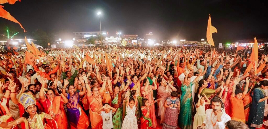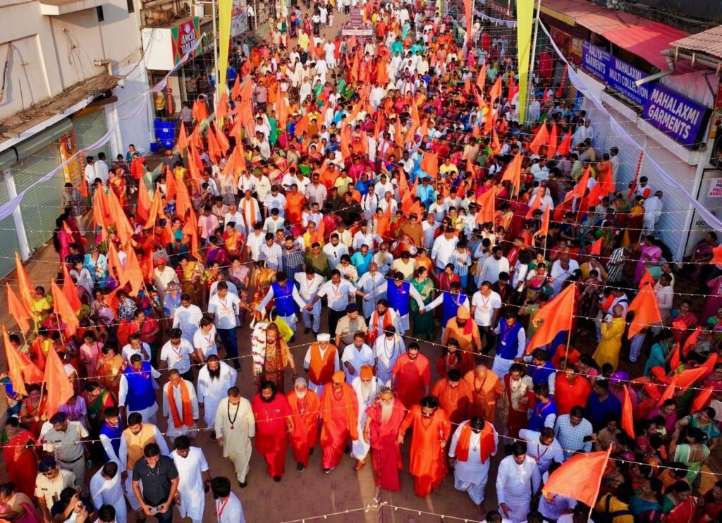 The auspicious beginning of the program was marked by Mahapujan at Shri Shantadurga Temple. Thereafter, amidst the resonating beats of dhol-tasha, chants of victory, and the divine Harinaam, a grand procession was taken out in the holy presence of saints and mahants. In the main ceremony that followed, the state leadership ceremonially honored the spiritual leadership (Sant Pujan), the grand Sea Maha Aarti was performed in the presence of saints, Union Minister Chirag Paswan was felicitated and shared his thoughts, revered saints delivered their blessings, and Sadguru Brahmeshanand Acharya Swamiji was conferred the title “Goa Swami” in a grand honor by the saints and mahants. Thousands of devotees were present.