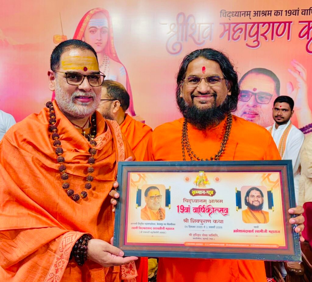 At the Vishal Sant Sabha organized at Chiddhyanam Ashram, Mira Road, under the leadership of Anantashri Vibhushit Mahamandaleshwar Swami Shri Chidambaranand Saraswati Maharajshri, Padmashri Sadguru Brahmeshanandacharya Swamiji, Peethadheeshwar of Shri Datta Padmanabh Peeth, delivered a powerful address highlighting the role of youth in shaping the future of the nation.